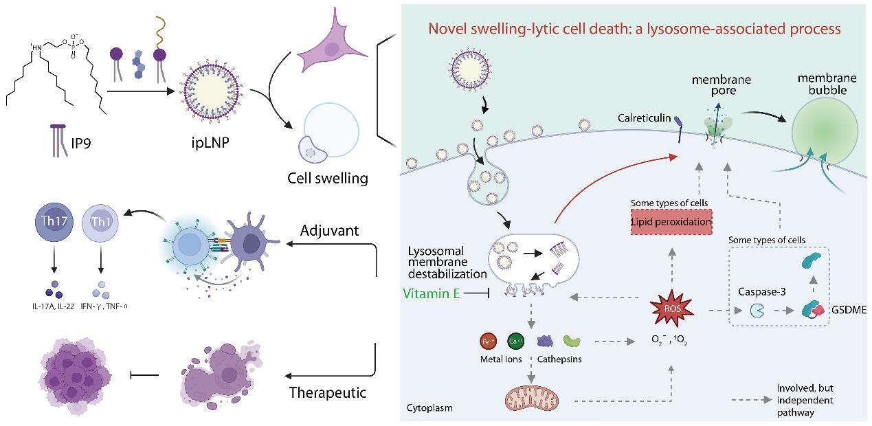 相关成果以Novel Swelling-Lytic Cell Death Triggered by Cargo-Free Ionizable Lipid Nanoparticles为题,近期发表于国际知名学术期刊《Advanced Science》(IF=14.1,一区TOP)。彩神xl(中国)有限公司为论文第一完成单位,彩神xl(中国)有限公司生命科学学院吴军军副教授、硕士生赵振男、硕士生吴鸿生以及泉州第一医院林思煌为论文的共同第一作者,彩神xl(中国)有限公司欧阳松应教授和泉州第一医院郑理玲教授为论文通讯作者。该研究得到了国家自然科学基金以及福建省自然科学基金等项目资助。