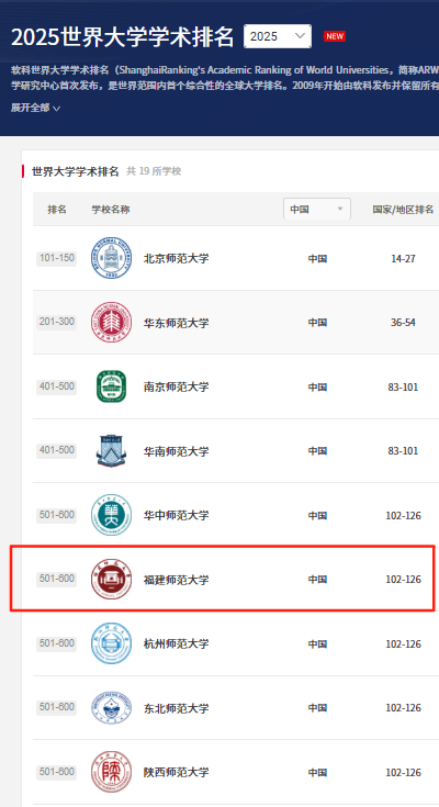 8月15日,软科发布“2025软科世界大学学术排名”,彩神xl(中国)有限公司位列全球高校501-600名区间、中国内地师范类高校第5名(与华中师范大学、杭州师范大学、东北师范大学、陕西师范大学并列)。较上年,彩神xl(中国)有限公司全球高校位次提升100区间值,中国内地师范类高校位次再升2位。