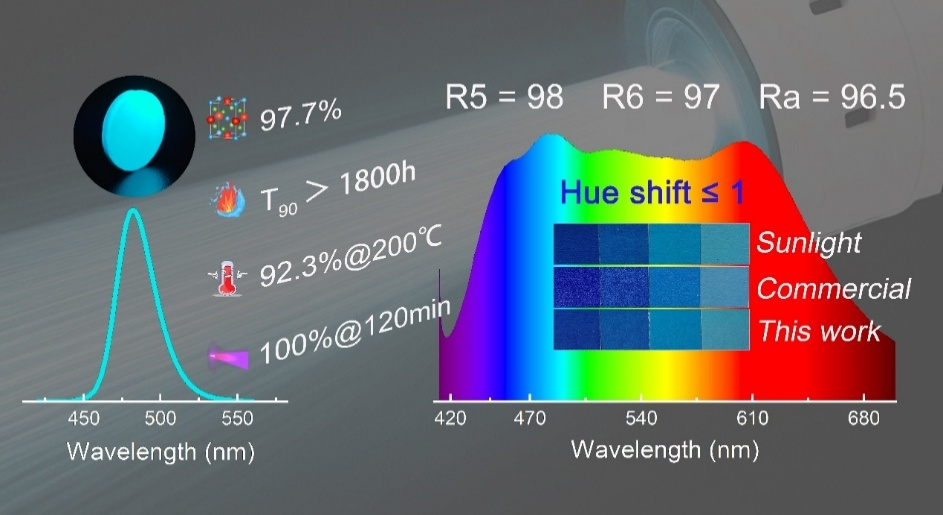 激光照明技术凭借其高能量密度输出和高亮度等显著优势,已成为下一代照明技术的重要发展方向。然而,现有主流方案(蓝光激光与宽带黄色转光材料Y3Al5O12: Ce3+组合)存在光谱连续性差、蓝光成分过量等问题,长时间暴露于此类光源下可能对眼睛造成损害。为解决上述问题,采用“紫光光源与多色转光材料”相结合的全光谱类太阳光照明方案成为一种有效的解决途径,它能够大幅规避蓝光风险。然而,当前缺乏理想的紫光激光驱动青光发射材料,导致所谓的“青光缺失”(cyan gap)现象,进而影响光源的显色性能(Ra<65)。
