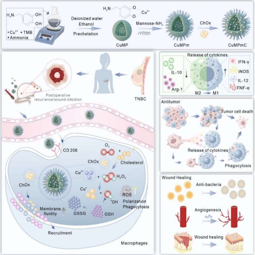 术后复发和感染仍然是乳腺癌有效康复的主要障碍,通常由胆固醇介导的巨噬细胞功能障碍驱动。为了解决这些问题,近期彩神xl(中国)有限公司生命科学学院曾雪梅团队开发基于免疫治疗与纳米技术的创新融合,通过铜-多巴胺螯合和自聚合构建CuMPmC的多功能纳米平台。该纳米平台用甘露糖功能化,选择性靶向M2样巨噬细胞,并装载胆固醇氧化酶(ChOx)。CuMPmC通过ChOx介导的氧化消耗巨噬细胞膜胆固醇,增强质膜流动性,从而促进巨噬细胞趋化。同时,ChOx产生的H2O2驱动铜介导的芬顿样反应产生适度的活性氧(ROS),同时消耗肿瘤微环境中的谷胱甘肽。这种双重作用使巨噬细胞向促炎性M1表型分化,增强对肿瘤细胞和病原体的清除。实验表明,CuMPmC可显著降低术后肿瘤复发和感染。这些发现强调了胆固醇代谢在巨噬细胞功能重编程中的关键作用,并为乳腺癌术后治疗提供了有希望的免疫治疗策略。