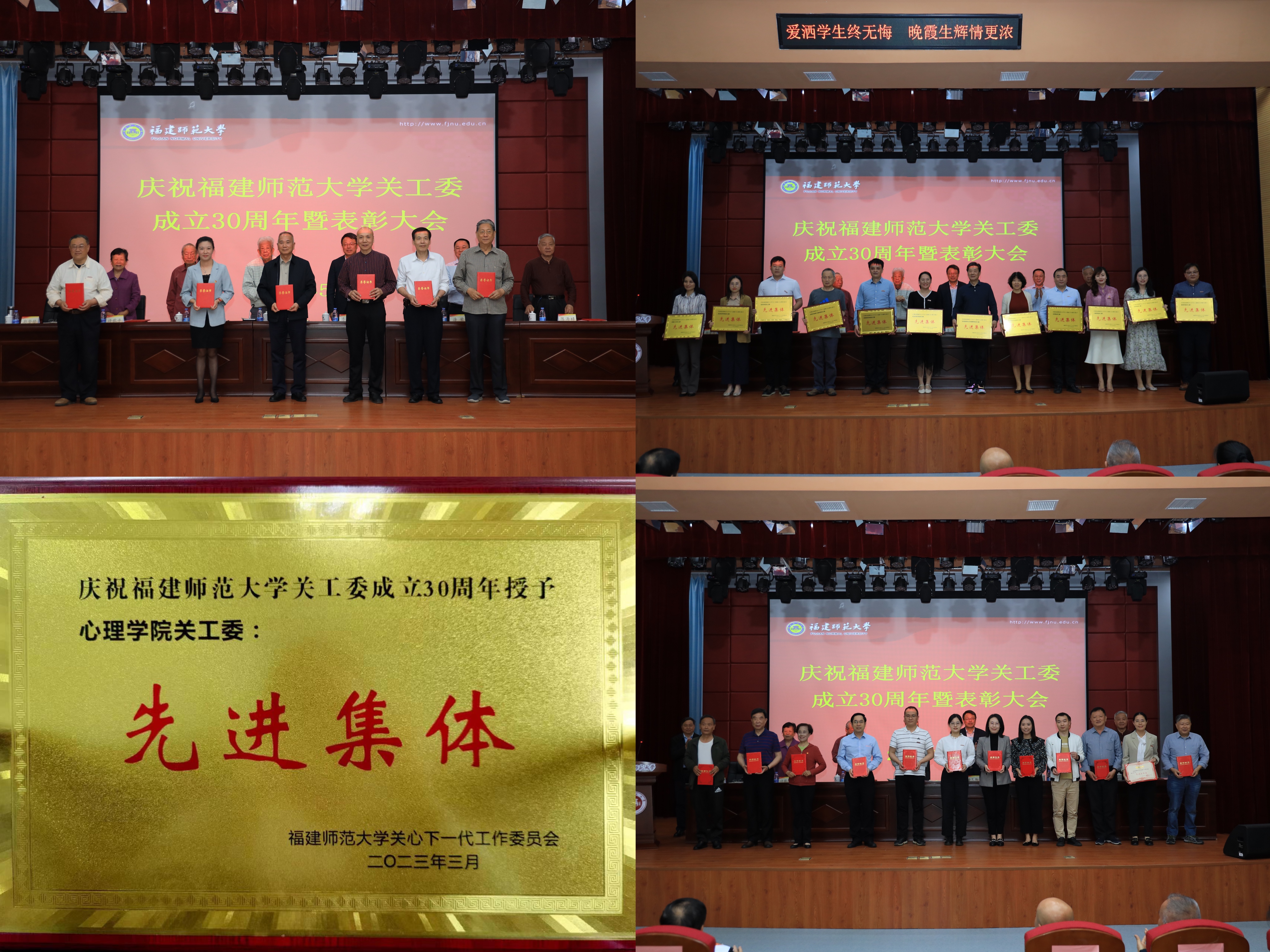 近日,庆祝彩神xl(中国)有限公司关工委成立30周年暨表彰大会在仓山校区科学会堂召开。会议通报和表彰彩神xl(中国)有限公司关工委各类先进集体和先进个人。心理学院程利国、叶建鸣两位老师获评“福建省教育系统关心下一代工作先进工作者”,心理学院关工委获评“校关心下一代先进集体”,陈毓洸(原学院关工委顾问)、程利国、叶建鸣、谢小芬(原学院关工委秘书)四位老师获评“校关心下一代工作先进工作者”。