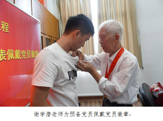 谢学潜和陈永保为新入党的学生党员代表佩戴党徽。学生党员表示,要学习老党员们一心向党、艰苦奋斗的崇高品质,为实现中华民族伟大复兴的中国梦贡献力量。