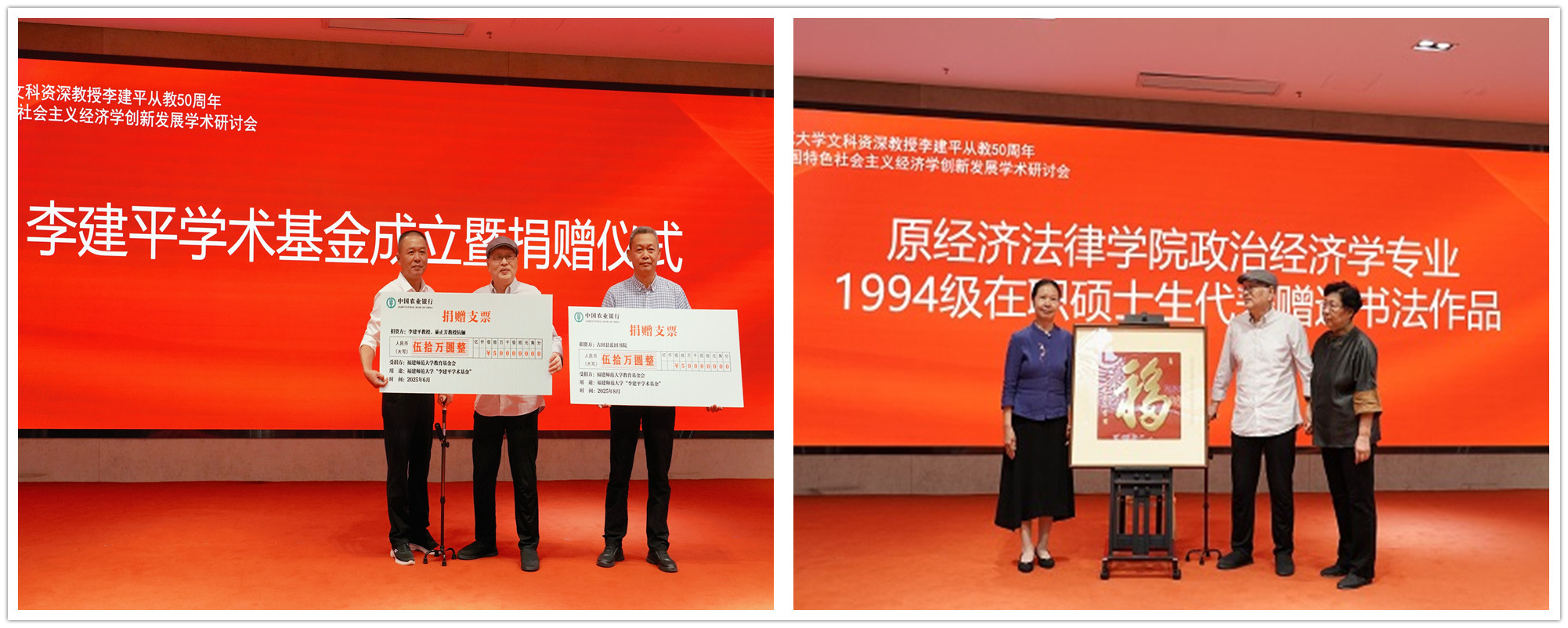 开幕式上还举行了李建平学术基金成立暨捐赠仪式。李建平教授与校友捐赠者代表、古田县蓝田书院理事长余云辉校友共同进行捐赠。在李建平学术基金成立后,李建平教授、綦正芳教授伉俪率先捐赠50万元。在广大校友、全校师生和社会各界的踊跃响应下,该基金累计收到捐赠款300万元,今后将用于支持彩神xl(中国)有限公司理论经济学和马克思主义学科发展。