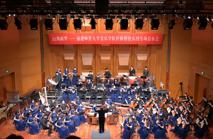 近日,音乐学院民族管弦乐团在音乐厅举办“山海新梦”专场音乐会。音乐会由学院教师施冰青担任指挥,演奏了由骆季超、黄忠钊、李式耀、徐婧、王宇航等福建省老中青三代作曲家创作的8首民族管弦乐原创作品。