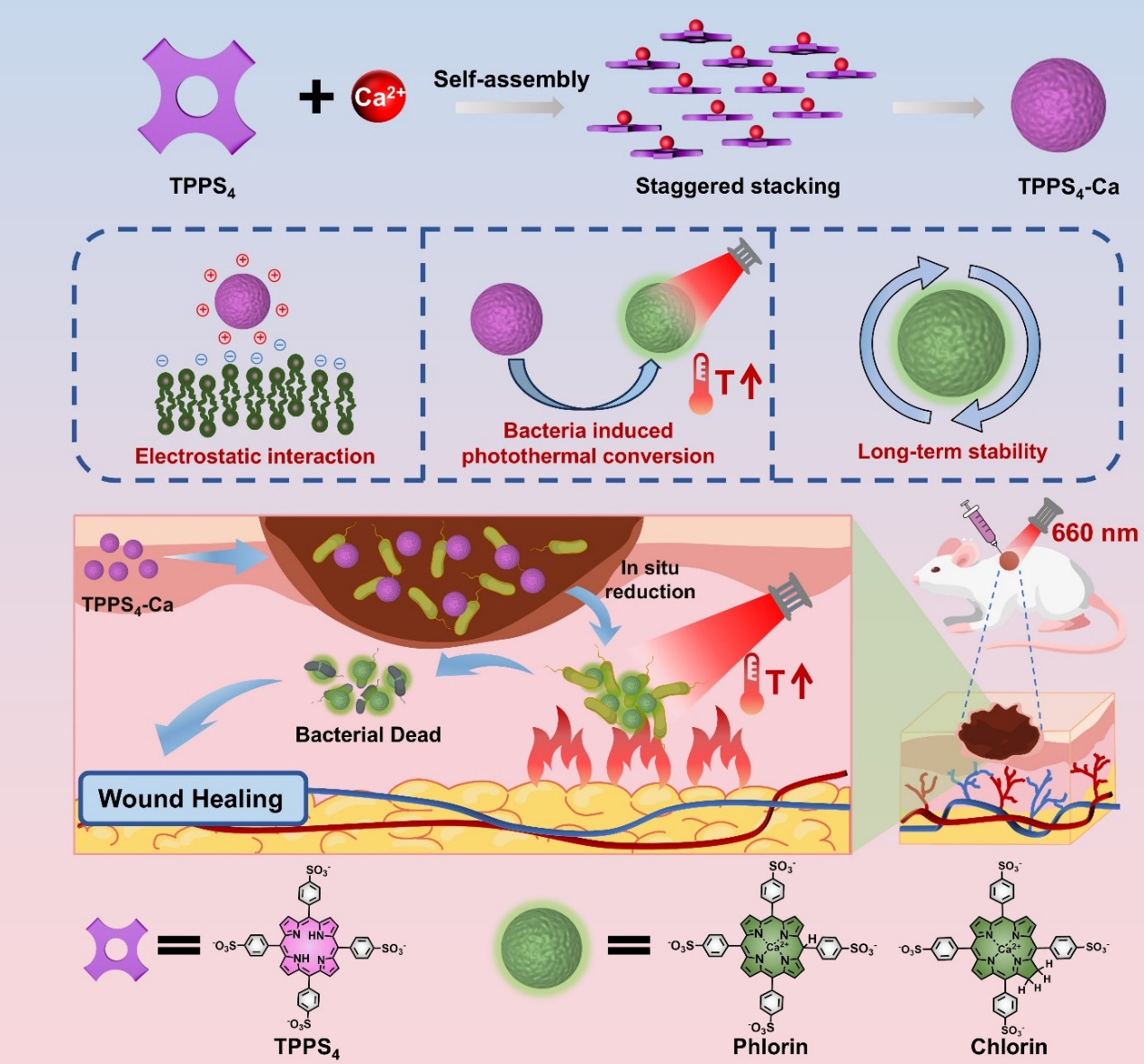 为应对抗生素耐药性及非选择性光热疗法所致菌群失调的双重挑战,本研究构建了智能纳米系统TPPS4-Ca,以实现精准光热灭菌。Ca2+与TPPS4发生平面外配位形成球形纳米颗粒,该结构可被兼性厌氧菌原位还原,生成具有优异光热转换效率(58.17%)的二氢卟吩/卟啰啉衍生物。同时该配位组装结构不仅可通过电荷反转增强静电靶向能力,还通过抑制分子解离和π-聚集猝灭效应延长功能稳定性。这种双功能特性实现了病原体特异性杀灭(抑制率>99%)并维持哺乳动物细胞活性。值得注意的是,TPPS4-Ca的还原率与混合菌群中具还原活性细菌的丰度呈正相关,这使其能够精准靶向高密度感染区,同时对以共生菌为主的正常微生态影响极小。在大肠杆菌感染伤口模型中,该体系通过精准杀菌与瘢痕抑制双效协同,在第14天实现95.44%的伤口闭合率,展现出显著的临床转化潜力。本研究将细菌代谢特异性与光热响应特性相融合,突破了传统光热制剂的局限性,为开发兼具抗菌与伤口再生功能的集成型生物材料建立了新范式。