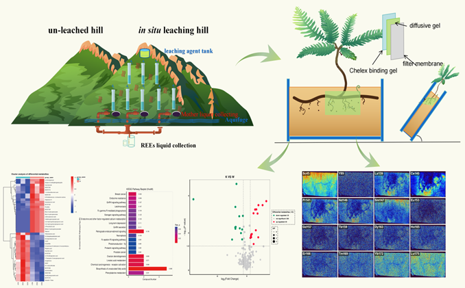 研究团队从离子吸附型稀土矿中采集了浸出和未浸出山丘的土壤样本,通过多学科手段,薄膜扩散梯度技术结合激光剥蚀-电感耦合等离子体质谱监测稀土元素的分布和动态变化,并利用非靶向液相色谱-飞行质谱分析芒萁根系分泌物中的代谢物。采用PCA对数据进行分析。研究发现,浸出土壤中的稀土元素浓度显著高于未浸出土壤,其中铈、镧、钇和钕含量最为丰富。芒萁在浸出土壤中的根、茎和叶片中的稀土元素浓度显著高于未浸出土壤,且稀土元素从根到叶片的转运能力显著增强,尤其是重稀土元素。生物富集因子和转运因子在浸出土壤中也更高,表明芒萁在浸出土壤中具有更强的稀土元素富集能力。发现稀土元素在芒萁根际土壤中富集,分析鉴定芒萁根系分泌物中的42种关键差异代谢物。这些代谢物对于芒萁在浸出条件下的应激耐受性至关重要。这项研究为稀土尾矿污染治理和稀土资源回收提供了新的思路,展现了植物富集技术在环境保护和资源循环利用方面的巨大潜力。
