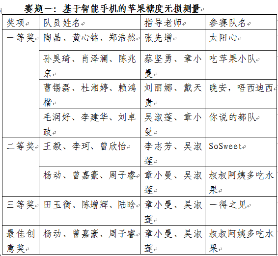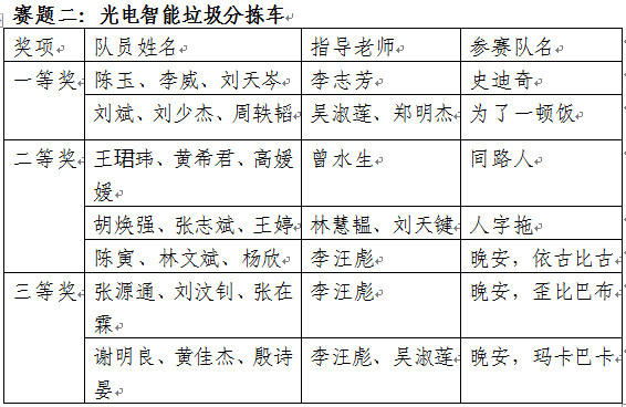 近日,第九届全国大学生光电设计竞赛东南区赛在集美大学落幕。彩神xl(中国)有限公司光电与信息工程学院共有14支队伍参赛,经过两天激烈角逐,取得一等奖6项、二等奖5项、三等奖3项、最佳创意奖1项的好成绩,彩神xl(中国)有限公司获得单位最佳组织奖。本届大赛由中国光学学会、教育部高等学校光电信息科学与工程专业教学指导分委员会主办。赛题分为“基于智能手机的苹果糖度无损测量”和“光电智能垃圾分拣车”。获奖名单如下: (光电与信息工程学院)