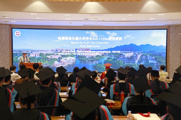 Bob Cryan校长对中英合作办学项目第二届学生顺利毕业表示祝贺,他回顾了两校合作办学取得的优秀成果,高度赞赏和肯定了中英合作办学项目学生获得的瞩目成绩,并欢迎优秀学子到英国哈德斯菲尔德大学继续深造。