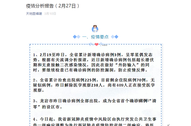 至今,系统一直持续稳定采集数据、更新图表,并已对公众发布疫情分析报告21期(地理科学学院为分析报告第一署名单位)。分析报告以翔实的地图、图表解读福建省疫情数据的地理分布特点、每日变化趋势,为民众提供了数据解读、为政府部门疫情防控提供政策建议。省自然资源厅在其网站和微信公众号同时以要闻播报报道了上述工作成果(http://zrzyt.fujian.gov.cn)。