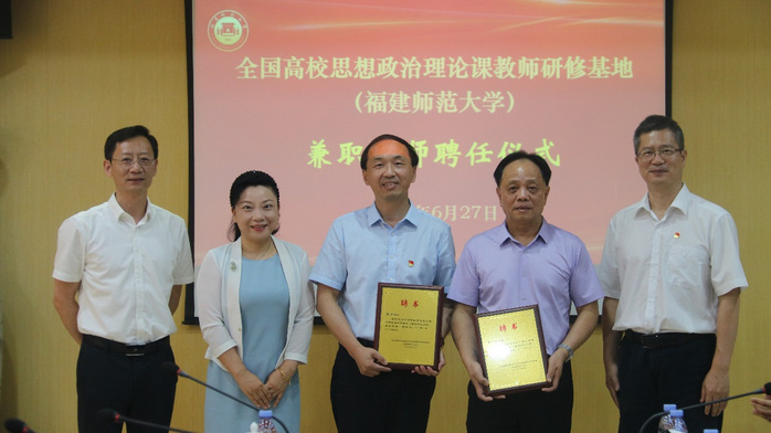 近日,全国高校思想政治理论课教师研修基地(彩神xl(中国)有限公司)举办兼职导师敦聘仪式,敦聘党的十七大代表、第十二届全国人大代表、南安市梅山镇蓉中村党委第一书记李振生,中国航空油料有限责任公司福建分公司党委书记、总经理郭兴为兼职导师。福建省教育厅思想政治工作处郑邦华处长,马克思主义学院党政领导班子参加了敦聘仪式。