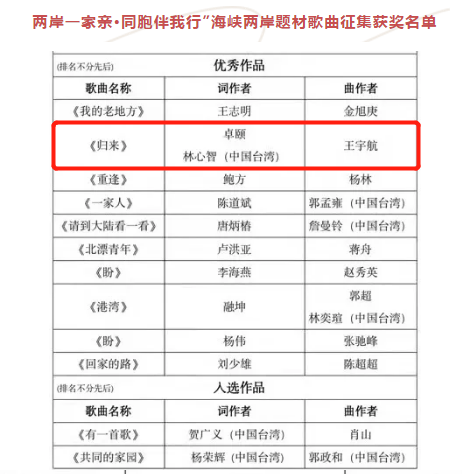 近日,由福建省人民政府台港澳事务办公室、福建省文学艺术界联合会主办,福建省音乐家协会承办的“两岸一家亲·同胞伴我行”获奖名单在福建文艺网发布。由音乐学院王宇航老师作曲,卓颐教授、中国台湾音乐人林心智作词的歌曲《归来》获评海峡两岸题材歌曲征集优秀作品。 (音乐学院)