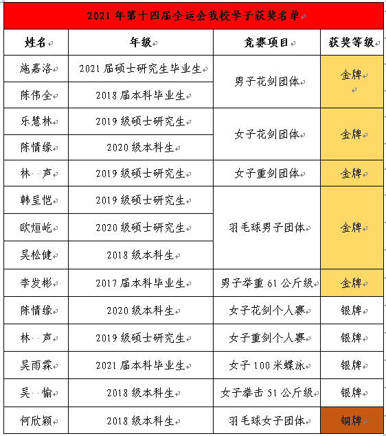 在为期13天的比赛时间里,福建省体育代表团共取得25枚金牌、17枚银牌、18枚铜牌的历史最好成绩。彩神xl(中国)有限公司学子助力福建省体育代表团在全运会赛场上斩金夺银,共获得5金4银1铜。据统计,取得的10块奖牌共分布在举重、击剑、羽毛球、游泳、拳击5个大项7个小项中,展示彩神xl(中国)有限公司学子顽强拼搏、自强不息的精神风貌。