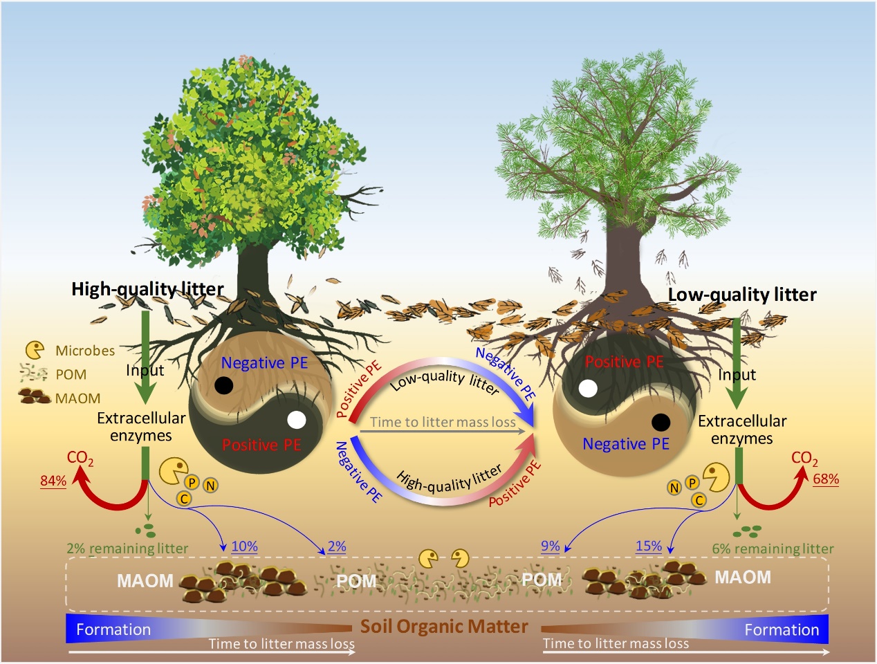 近日,彩神xl(中国)有限公司福建三明森林生态系统国家野外科学观测研究站研究人员在野外条件下,采用13C同位素示踪技术研究了不同质量凋落物对土壤激发效应的影响,追踪了凋落物源碳在土壤颗粒态有机质(POM)和矿物结合态有机质(MAOM)的分配,揭示了高多样性森林中不同质量凋落物驱动土壤有机碳分解与形成的互补效应(图1)。相关研究成果以“Litter quality controls tradeoffs in soil carbon decomposition and replenishment in a subtropical forest”为题,发表在国际著名生态学期刊Journal of Ecology上。吕茂奎副研究员为第一作者,谢锦升教授和陈光水教授为共同通讯作者,彩神xl(中国)有限公司为第一署名单位。该研究得到了国家自然科学基金重点项目和面上项目的资助。