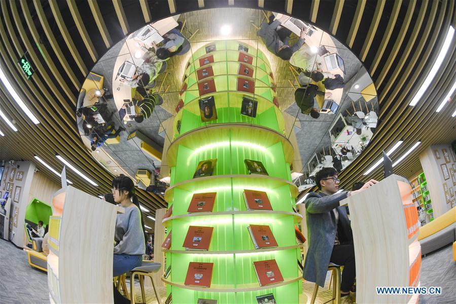 Students are seen at the 24-hour study at Fujian Normal University in Fuzhou, southeast China's Fujian Province, Feb. 28, 2019. The 24-hour study opened to students as the new semester started at Fujian Normal University. The study was equipped with sleeping cabins, self-help book lending system, etc. (Xinhua/Song Weiwei)