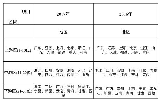 2016-2017年期间,个别省、市、区经济综合竞争力排位的升降出现了跨区段变化,表现在山西省由下游区跨入中游区,前进了4位;吉林省由中游区降入下游区,下降了3位。