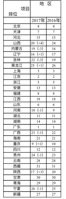 与2016年相比较,2017年排位上升的有5个省、区、市,上升幅度最大的是山西省,排位上升了4位,陕西省上升了3位,重庆市、黑龙江省和辽宁省均上升了1位;20个省、区、市排位没有变化;排位下降的有6个省、区、市,下降幅度最大的是吉林省和内蒙古自治区,排位下降了3位,河南省、广西壮族自治区、贵州省和宁夏回族自治区均下降了1位。