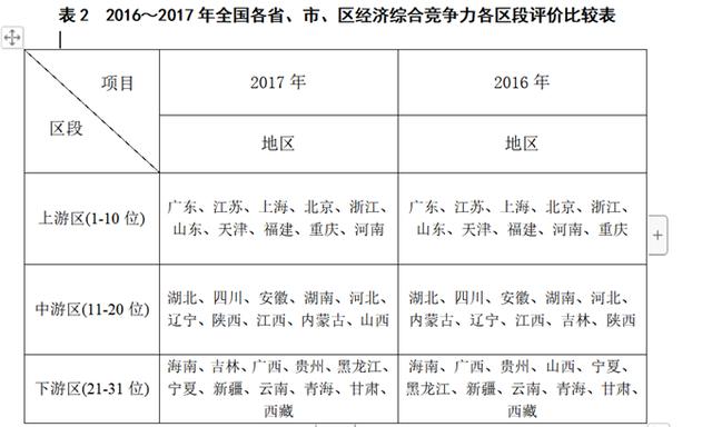 2016~2017年全国各省、市、区经济综合竞争力各区段评价比较表