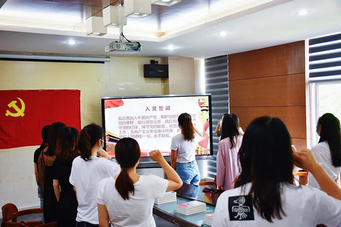 毕业生党员面向党旗庄严宣誓,重温入党誓言。