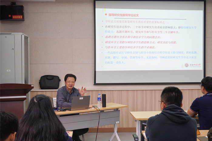 黄汉升教授结合自身多年科研工作及研究生指导经验,从开题报告的概念、主要目的、撰写要求、应避免的误区以及开题之后需处理的事项等5个方面,对研究生学位论文开题报告中各个环节、细节的重点难点进行了详细阐述。他强调,体育学研究生的学术能力决定了中国体育科研创新的高度,决定了建设体育强国的速度。开题报告能够检验研究生对专业理论知识的独立驾驭能力和研究能力,研究生要找准研究方向、理清研究思路、拓展专业知识面,既要“站在巨人的肩膀上”,也要“凸显自己的能力”;要做好扎实的文献整理与研读工作,力求在研究的创新、深度、方法等方面有所改善,以保障研究工作的质量;要注重逻辑思维能力的锻炼,确保论文撰写符合逻辑结构要求,最终构建形成科学合理的知识体系。