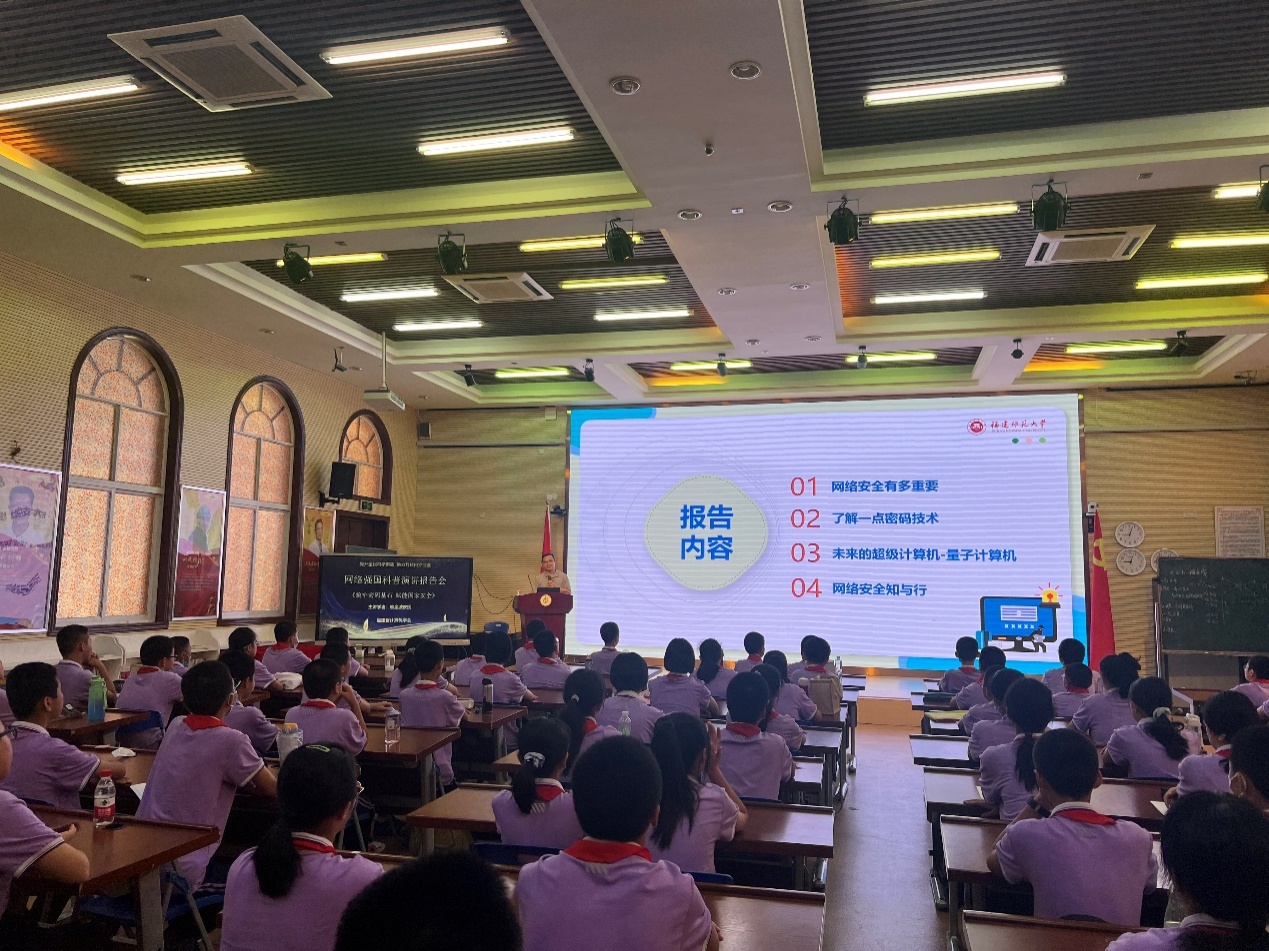 9月23日,福建省2023年全国科普日活动——网络强国科普演讲报告会在福州屏东中学举行,2000余名中小学生以线上、线下形式参与了活动。彩神xl(中国)有限公司计算机与网络空间安全学院软件工程系主任熊金波教授应邀为青少年作题为《筑牢密码基石,赋能国家安全》科普讲座。他结合科研经验,用真实案例深入浅出地介绍了生活中常见的网络安全隐患,生动阐述了密码技术对网络安全、国家安全的重要性,帮助青少年提高网络安全防范意识。活动现场互动频繁,气氛活跃。(计算机与网络空间安全学院)