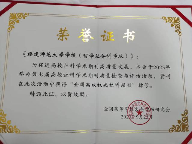 近日,在全国高等学校文科学报研究会举办的第七届高校社科学术期刊质量检查与评估中,《彩神xl(中国)有限公司学报(哲学社会科学版)》被评为“全国高校权威社科期刊”。