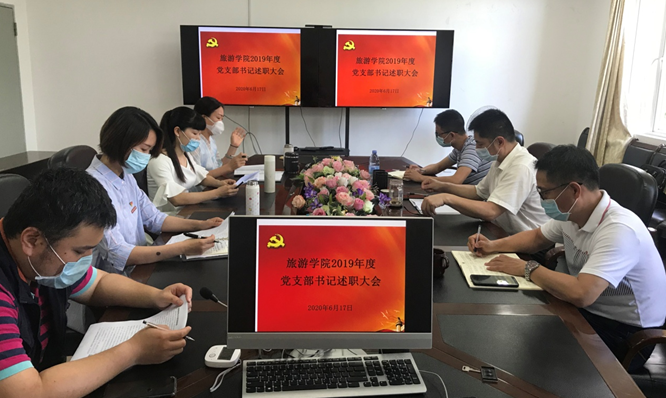 近日,旅游学院党委举行党支部书记抓基层党建工作述职评议大会,院党委委员及各党支部书记参加。述职采取线下和线上相结合的方式进行。会议由学院党委书记余培雄主持。余培雄对8位党支部书记一年来抓基层党建工作给予了充分的肯定,并指出了工作中存在的问题。他强调在当前防控疫情工作中,党组织要积极发挥战斗堡垒作用、党员要积极发挥先锋模范作用,让党旗在防控疫情的战斗中高高飘扬。 (旅游学院 陈慧眉)