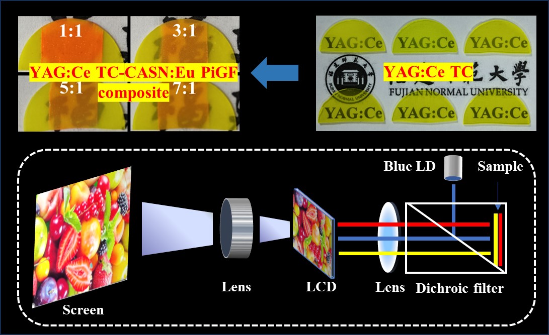 进一步地,课题组提出将红光发射CASN: Eu荧光粉与玻璃混合后共烧于YAG: Ce透明陶瓷上,获得CASN: Eu - YAG: Ce复合转光材料。该设计巧妙地利用透明陶瓷既作为发光层,又作为高导热衬底,使得CASN: Eu荧光玻璃陶瓷薄膜也保持了优异的发光性能。此外,红光成分补偿使得基于复合材料的白光显色指数得到明显提升,获得了超高亮度、高品质激光驱动白光光源。基于复合材料构建了激光投影显示原型器件,验证了转光材料在投影显示领域的应用可行性。研究成果以Novel Color Converters for High Brightness Laser-Driven Projection Display: Transparent Ceramics - Glass Ceramics Film Composite为题发表于Advanced Functional Materials。论文第一单位为彩神xl(中国)有限公司,硕士研究生廖盛祥、博士研究生金世林为共同第一作者,林世盛博士和陈大钦教授为本文共同通讯作者。