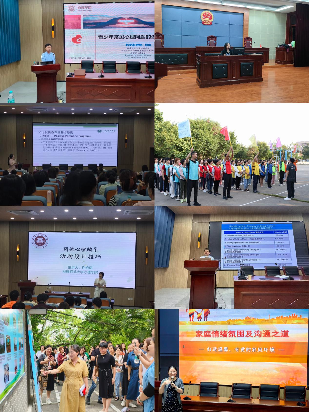 本次培训内容丰富、形式多样,由理论到实操,逐层递进。采用专题讲座、团辅活动、工作坊、讨论交流、现场观摩等多种方式,包括《未成年人保护法》《家庭教育促进法》等相关法律法规的重点解析,《青少年常见心理问题的识别与干预》《积极家庭教育技巧》《家庭中的情绪氛围及沟通之道工作坊》《学校家庭教育指导与家校沟通》等专题讲座,以及拓展训练活动、团辅活动设计技巧、参观仓山区青少年心理咨询中心等。