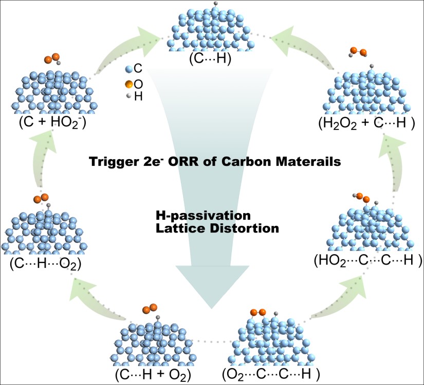 基于此,彩神xl(中国)有限公司林良旭教授团队以碳布材料为研究对象,通过设计一种由氢原子钝化的晶格扭曲结构,实现了高效、稳定和高选择性两电子ORR反应,系统阐述了碳材料晶格扭曲和氢钝化在电催化活化上和选择性调控中的关键作用,为碳材料的ORR催化机理机制提供了新的理解,并为进一步阐述碳材料的ORR催化活化机制提供新的强有力的依据。该研究所阐述的催化活化机制是对碳材料ORR催化机理的有力补充,也解释了为什么碳材料在ORR中所表现出的诸多难以理解的实验现象,为更精准的催化电极设计提供参考和依据。相关研究成果以“Lattice Distortion and H-passivation in Pure Carbon Electrocatalysts for Efficient and Stable Two-electron Oxygen Reduction to H2O2”为题发表在国际知名期刊Angewandte Chemie International Edition。