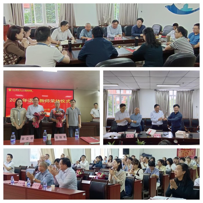 近日,文化旅游与公共管理学院举办2023年退休教师荣休仪式。宋立中、张铃枣两位教授及全院教职工参加了活动。