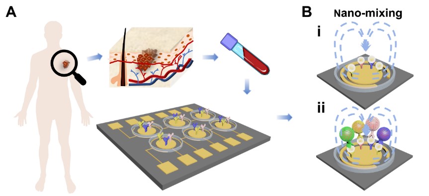 外泌体在细胞间通讯、肿瘤微环境调节、免疫抑制等生理和病理过程中具有重大作用。然而外泌体的常规分离分析方法灵敏度低,需要样品量大,极大限制了外泌体作为体液疾病标志物在临床的应用。近期,彩神xl(中国)有限公司光电与信息工程学院王静研究员提出微流控芯片结合表面增强拉曼光谱技术的外泌体检测方法。该方法的检测灵敏度为1个/µL,且仅需10 µL血清、血浆样品。利用该方法,从实验上证实了不同肿瘤来源外泌体的蛋白表型存在高度异质性。该成果发表在ACS Sensors(SCI一区,IF=7.71),王静研究员为第一作者。该方法还可以灵敏地检测早期黑素瘤患者血清中肿瘤相关外泌体,有望用于黑素瘤的早期筛查诊断。该工作发表于Advanced Functional Materials(SCI一区,IF=18.81),王静研究员为第一作者。