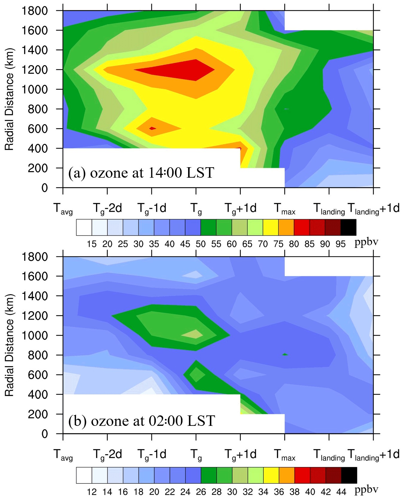 台风不同生命阶段中(横轴),台风中心不同距离处(竖轴)的近地面臭氧浓度(单位:ppbv)。上下两图分别为白天臭氧光化学反应活跃的时刻(14时)和夜间光化学反应停止的时刻(02时);台风生命阶段分为台风生成Tg及其前后相邻数天(Tg-2d, Tg-1d和Tg+1d),台风发展最盛Tmax ,台风登陆(Tlanding)和登陆后阶段(Tlanding +1d), Tavg代表多年平均臭氧背景含量
