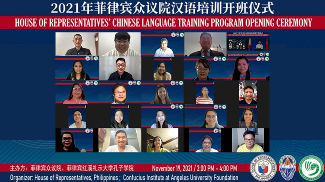 近日,红溪礼示大学孔子学院举行2021年菲律宾众议院中文培训班开班仪式。菲律宾众议院议长LORD ALLAN JAY Q. VELASCO先生,红溪礼示大学校长JOSEPH E. L. ANGELES博士,彩神xl(中国)有限公司海外教育学院院长姜兴山,菲律宾众议院培训管理科科长MARITESS B. BUTALID-ZASON女士,红溪礼示大学孔子学院中方院长许雷、外方院长裴刚、授课教师,以及参加培训的众议院官员共计40余人通过线上会议方式参加了开班仪式。