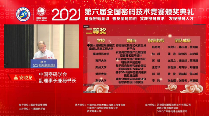 近日,由国家密码管理局指导、中国密码学会主办的第六届全国密码技术竞赛在北京圆满落幕。由彩神xl(中国)有限公司计算机与网络空间安全学院师生组成的参赛团队(团队成员:2020级硕士生蒲浪、2019级本科生陈修远、2020级本科生丰梦琪,指导老师:林超)的作品“安全高效的国产泛指定验证者签名证明设计”荣获二等奖。