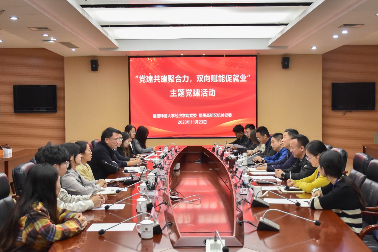 11月23日,经济学院党委与福州高新区机关党委联合开展的“党建共建聚合力,双向赋能促就业”主题党建活动在彩神xl(中国)有限公司旗山校区举行。福州高新区党工委委员、区机关党委书记熊国华,区机关党委专职副书记林善捷,区经济发展局、商务局等党务干部,经济学院党委书记俞建群、副书记叶龙祥、师生党员代表共20余人参加活动。座谈会由俞建群主持。