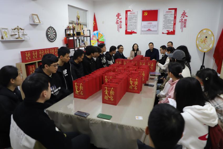 近日,法学院、纪检监察学院党政领导深入“一站式”学生社区慰问考研学生,表达关心和祝福。活动现场,学院领导为考研学子送上 “考研上岸礼包”,勉励同学们坚守考研初心和信心,保持良好心态,劳逸结合,以最饱满的精神状态从容应考。学院一直以来高度重视学生考研工作,专设学生考研复习室,并通过标语宣传、考研心愿墙、学弟学妹送祝福贺卡等暖心举措,积极营造良好氛围,及时关注学生考研过程的诉求,为学生成长成才提供全方位的指导和帮助。(法学院、纪检监察学院)