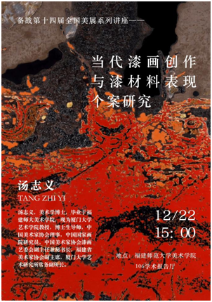 专家简介:汤志义,美术学博士,现为厦门大学艺术学院教授,博士生导师,中国美术家协会理事,中国国家画院研究员,中国美术家协会漆画艺委会副主任兼秘书长、福建省美术家协会副主席。漆画作品获第十届全国美展金奖、第十二届全国美展提名奖;被中国美术馆、中国国家画院美术馆、中国国家新闻中心、福建博物院、湖北美术馆、福建美术馆、厦门美术馆、德国总领事馆等重要机构收藏。