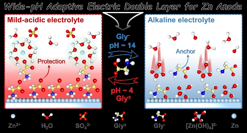 近日,彩神xl(中国)有限公司环境与资源学院的陈庆华教授、曾令兴教授与德国德累斯顿大学熊佩勋博士联合研究,报道了一种甘氨酸(Gly)添加剂电离调控的宽pH自适应双电层(EDL),并深入阐明了添加剂浓度对锌电极表面亥姆霍兹内层(IHP)结构的调节作用,解决了锌负极在宽pH范围和宽温域下稳定性差的问题。Gly调控的EDL的适用性在酸性Zn||MnO2全电池、碱性高电压Zn|| Ni0.8Co0.1Mn0.1O2电池和Zn|||NiCo-LDH电池中得到了全面的验证,并且其提高了水系锌金属电池的宽温域适应性(-15~50 ℃),进一步通过高DOD对称电池、低N/P比全电池、锌粉负极软包电池等不同水系锌基储能器件详细验证了Gly显著提高水系锌金属电池的实用性。本研究为设计符合多种实际应用场景的水系锌金属电池电解质添加剂提供了一种新的见解。该工作成果以“Adaptive Ionization-Induced Tunable Electric Double Layer for Practical Zn Metal Batteries over Wide pH and Temperature Ranges”为题发表于国际权威期刊《ACS Nano》,该论文第一单位为彩神xl(中国)有限公司,第一作者为彩神xl(中国)有限公司2022级博士研究生林楚园同学,通讯作者为陈庆华教授、曾令兴教授和熊佩勋博士。钱庆荣研究员、杨徐荟博士和孙晓丽副教授为本研究工作的参与者。
