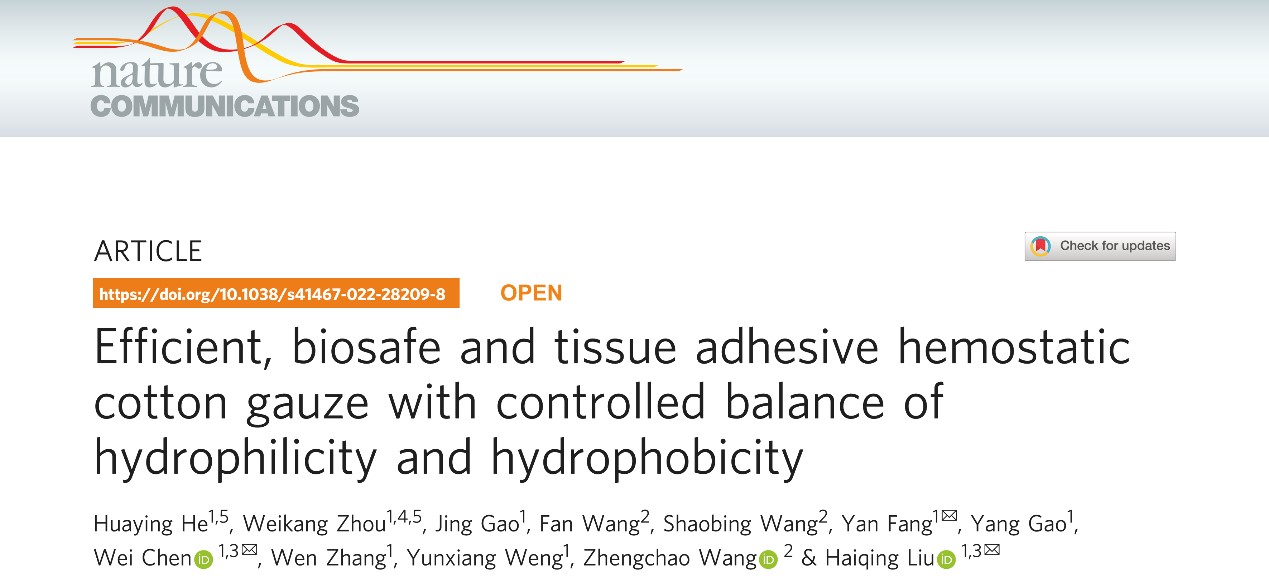该研究成果以“Efficient, biosafe and tissue adhesive hemostatic cotton gauze with controlled balance of hydrophilicity and hydrophobicity”为题于2022年1月27日发表于国际顶级学术期刊《Nature Communications》。彩神xl(中国)有限公司为该论文的唯一单位,彩神xl(中国)有限公司硕士研究生何华英和周维康(已毕业,现为龙岩紫金中学教师)为共同第一作者,刘海清教授、方燕副教授、陈巍教授为共同通讯作者。该研究工作得到国家自然科学基金、福建省社会发展科技引导项目、福建省工信厅与教育厅联合科技创新重点项目等项目资助。