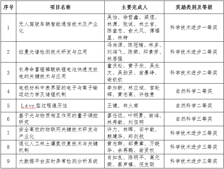 近日,福建省人民政府公布2020年度福建省科学技术奖获奖名单,彩神xl(中国)有限公司共有9项成果获奖,其中科学技术进步奖一等奖1项、二等奖2项、三等奖3项;自然科学奖二等奖2项、三等奖1项。此外,彩神xl(中国)有限公司参与完成的4项研究成果获科学技术进步奖三等奖。(科学技术处)