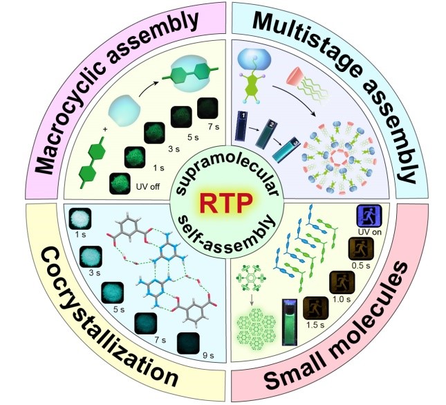 室温磷光材料在照明显示、安全标识、防伪加密等方面的实际应用,迫切需要室温磷光材料具有超长发光寿命和高磷光效率。此外,实现在水溶液中室温磷光,甚至是近红外磷光,以及近红外激发室温磷光,对其在生物成像方面的应用具有重要意义。目前,实现上述发光现象面临着巨大的挑战。超分子自组装为解决上述问题提供了有效的策略。例如,构筑超分子共晶框架,可以同时提高室温磷光效率和延长磷光发光寿命。通过大环宿主和发光染料超分子主客体组装,可实现水溶液中的纯有机室温磷光和近红外激发的室温磷光。采用多级超分子组装,可以获得近红外室温磷光。利用超分子自组装增强纯有机室温磷光的研究,还处于初级阶段,缺乏系统的研究。