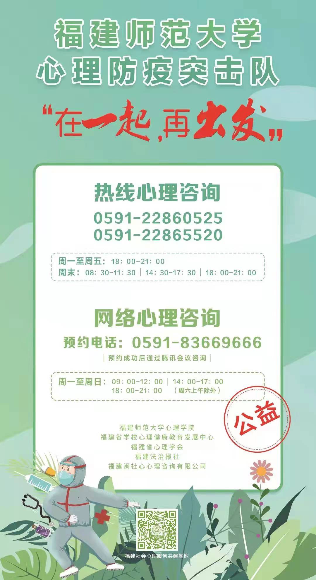为应对疫情期间民众可能产生的负面情绪,近日,心理学院联合福建省心理学会、福建省学校心理健康教育发展中心与福建法治报社等多家机构,组织100余名专家志愿者组成心理防疫突击队,向群众开放“疫情防控心理援助AI云平台”,让广大群众可安全、便捷地享受到优质的心理健康服务。据悉,心理防疫突击队将免费提供心理健康测评服务、心理科普音视频课程,开展线上视频咨询、网络送课下基层、校园心理咨询专题督导等公益活动,联手筑牢我省心理健康“防火墙”。(心理学院)