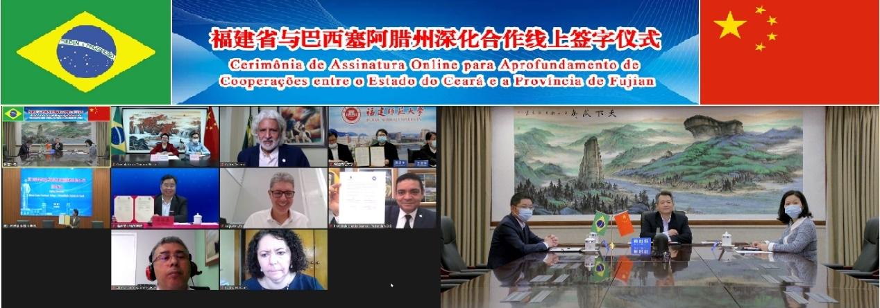 3月30日,福建省与巴西塞阿腊州举行深化合作线上签字仪式。中国驻累西腓总领事严宇清,福建省外事办公室主任陈出新、副主任黄劭蓉、教育厅副厅长王飏,塞阿腊州国际关系厅厅长塞萨尔·里贝罗、科学技术和高等教育厅厅长卡洛斯·德西莫,以及包括彩神xl(中国)有限公司在内的两省州高校领导等出席签字仪式。陈出新主任同里贝罗厅长共同签署了《中华人民共和国福建省与巴西联邦共和国塞阿腊州建立丝路伙伴关系备忘录》。