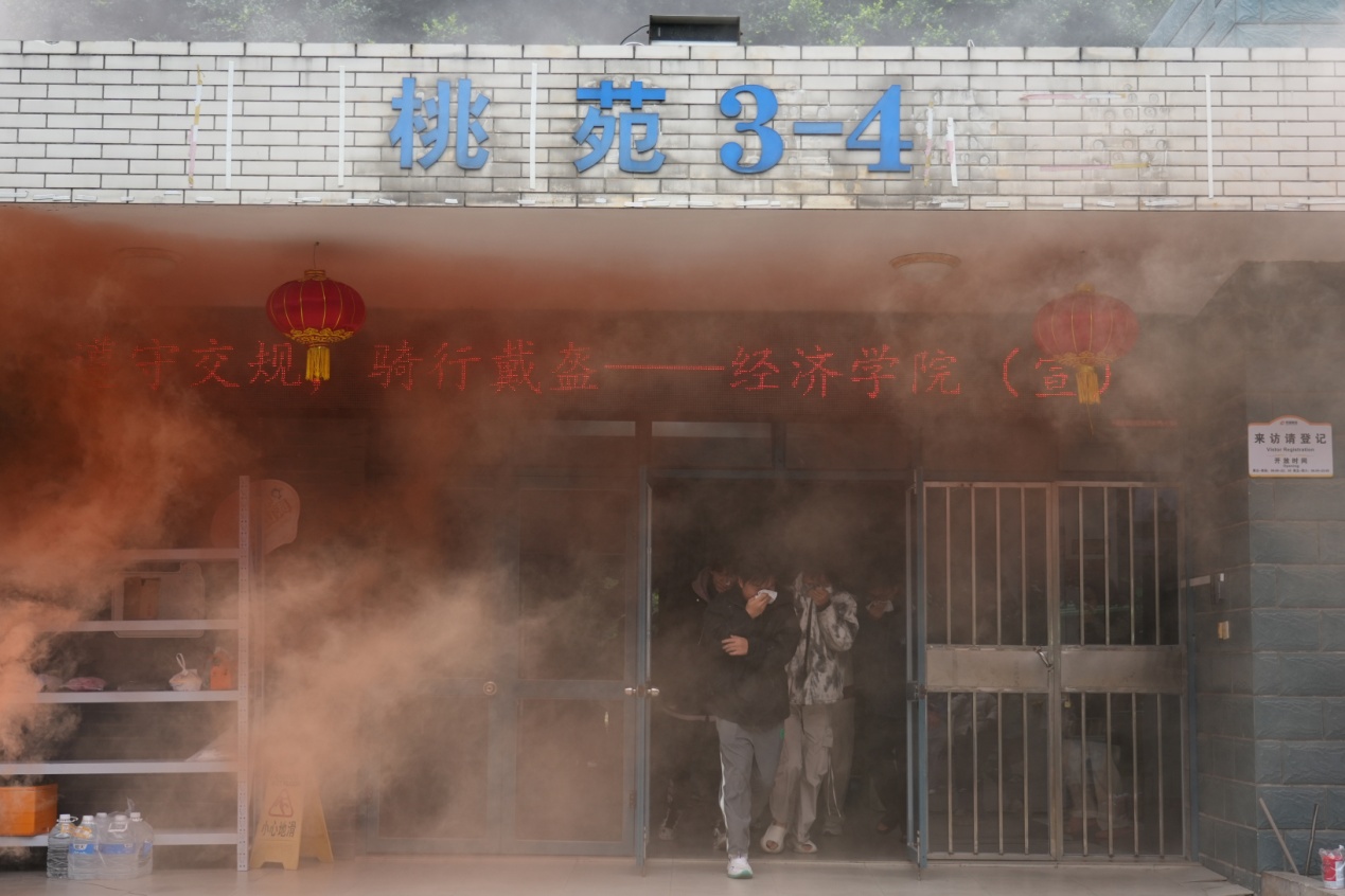 随着警报声响起,参加演练师生迅速进入状态,大家用湿毛巾捂住口鼻,弯腰小步快走,按预案的紧急疏散线路从楼梯迅速且有序下楼,短时间内疏散到安全地带。各楼层负责人进行人数清点并汇报情况,确认所有人员都安全到达。随后,赵巍点评了演练情况,详细讲解火场应急知识,示范逃生疏散注意事项,进一步增强了师生消防安全意识与自我保护能力。