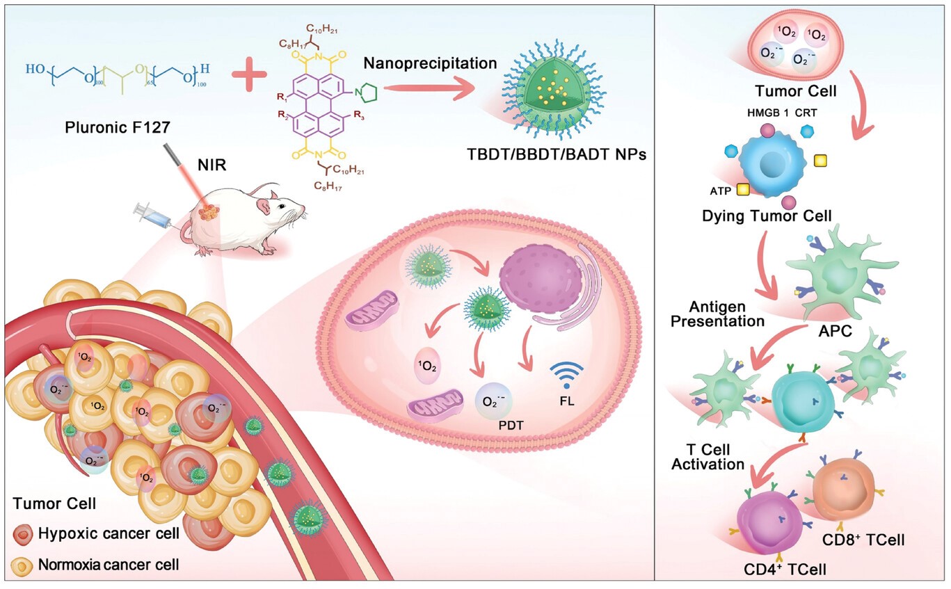 近年来,癌症对人类的威胁变得越来越紧迫。传统的临床治疗如化疗、手术和放疗,通常是侵略性的、非选择性的,并可能对健康器官产生不良影响。光动力疗法(PDT)由于其低全身毒性和非侵袭性,已成为一种有前景的癌症治疗方式。大多数现有的PDT是基于II型光反应过程,其高度依赖于光敏剂周围的O2水平,需要大量消耗O2来产生单线态氧1O2。由于实体肿瘤中通常表现为严重缺氧,最终导致光动力治疗结果不尽人意。近年来,I型光敏剂被证明可以在低氧环境下高效产生O2•−,进而增强光动力治疗效果。