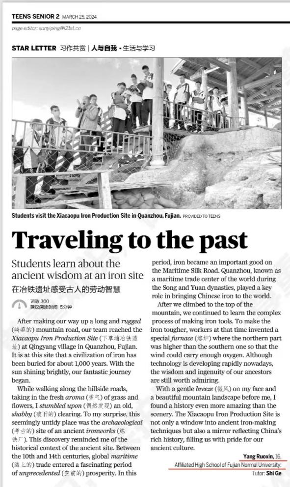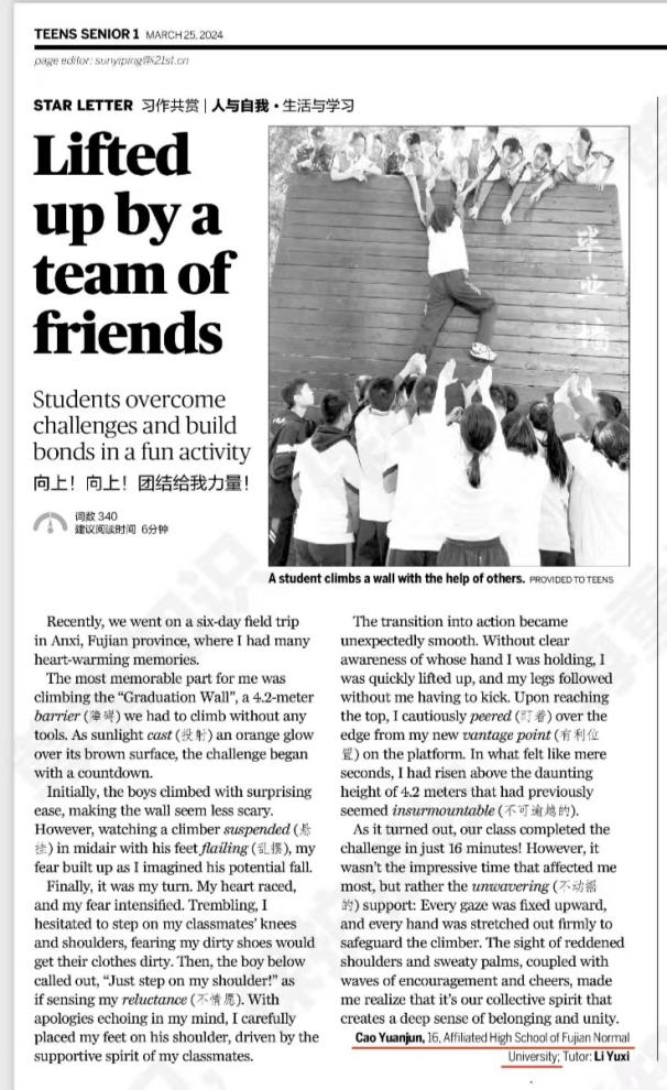 近日,《中国日报•二十一世纪学生英文报》刊发彩神xl(中国)有限公司附中高二年级学子曹袁珺、杨若欣的两篇英文文章,文中生动描述了附中在泉州安溪开展“行走的思政课”研学实践活动的体验和感悟,展现附中落实学科思政的育人成果。