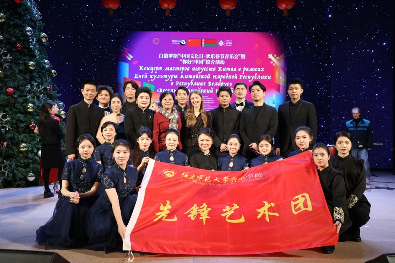 From December 19 to 27, a delegation of 22 faculty members and students from the School of Music at Fujian Normal University traveled to Minsk, Belarus, to take part in the "Chinese Culture Day – Happy Spring Festival Concert" and the "Hello, China" promotional event. The event was co-organized by the Ministry of Culture of the Republic of Belarus, the Ministry of Culture and Tourism of the People's Republic of China, and the Chinese Embassy in Belarus. With their exceptional artistic performances, the delegation successfully completed their mission, earning widespread acclaim from both Chinese and Belarusian audiences. Major media outlets, including Xinhua News AgencyPeople’s Daily OnlineGuangming Daily, and Economic Daily, provided extensive coverage of the event.