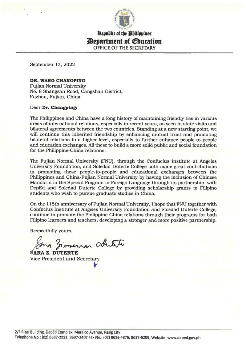Recently, Sara Z. Duterte, Vice President and Secretary of Education of Philippine, sent a congratulation letter to Fujian Normal University (FNU) for its 115th Anniversary. The original letter and the translated version are as follows: