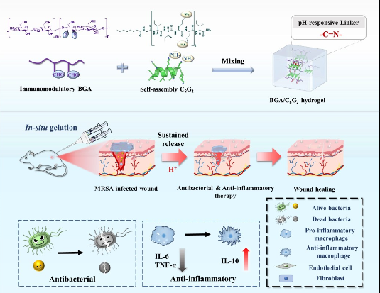Bacterial infections and excessive inflammation can impede the healing of wounds. Hydrogels have emerged as a promising approach for dressing bacterial-infected injuries. However, some antibacterial hydrogels are complex, costly, and even require assistance with other instruments such as infrared light, making them unsuitable for routine outdoor injuries. The work, entitled “An Additive-Free Multifunctional β-Glucan-Peptide Hydrogel Participates in the Whole Process of Bacterial-Infected Wound Healing”, was published in the top medical journal Journal of Controlled Release. The research reports an in-situ generating hydrogel constructed from oxidized β-D-glucan and an amphiphilic antimicrobial peptide. This hydrogel is easily accessible and actively contributes to the whole healing process of bacteria-infected wounds through antibacterial activity and and immunomodulatory activity inherent in the two-component system. The reversible imine bond enables the hydrogel to sustainably release the antibacterial peptide and inflammation-regulating β-D-glucan around the wound tissue, inhibiting the release of excessive inflammatory factors while promoting the release of anti-inflammatory factors, and thus accelerating wound healing. Meanwhile, the wetness and network structure inherent in the hydrogel make it capable of stopping bleeding and promoting cell migration. In methicillin-resistant Staphylococcus aureus (MRSA)-infected full-thickness skin wound models, the hydrogel showed superior antibacterial and anti-inflammatory activity, and expedited wound healing. The hydrogel also inhibited the expression of inflammatory factors and promoted the production of anti-inflammatory factors in vivo, while enhancing M2 macrophage polarization and accelerating epidermal tissue regeneration. These features make this hydrogel an appealing wound dressing for treating multi-drug-resistant bacteria-infected wounds.
