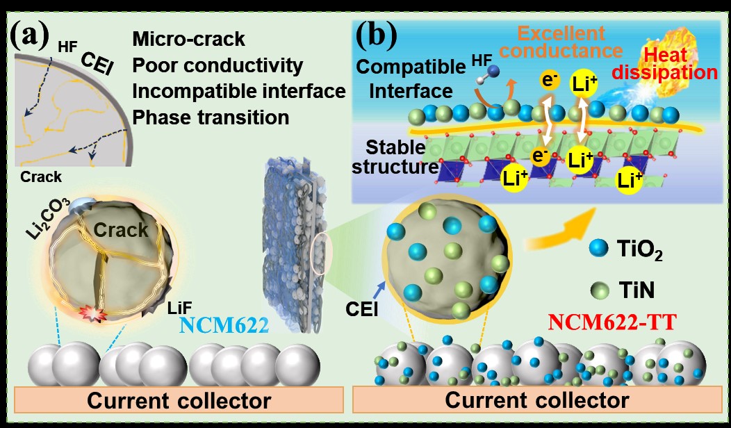随着消费者对电动汽车续航里程的需求不断增加,开发更高比能量的电池体系成为当下科研界及工业界共同追求的目标。对比当下现存的材料体系,高镍层状结构正极材料(NCM622)凭借高能量密度、高工作电压及低成本的优势,成为当下车用动力电池电极材料的主流选择。然而,其在高温条件下充放电容易发生颗粒破碎、体相结构破裂等问题,这可能加剧电池的热失控问题,引发电动汽车自燃。